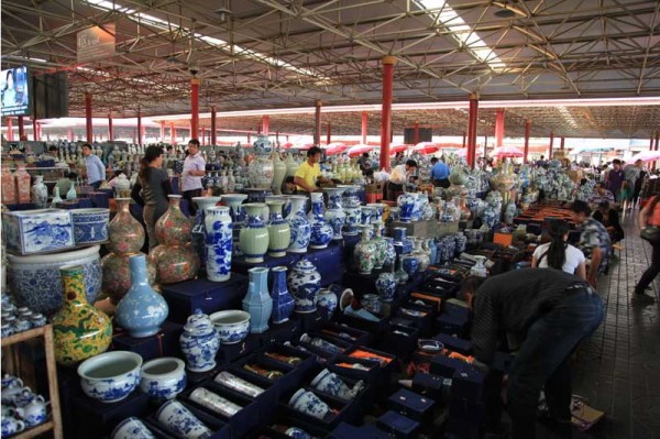 潘家园古玩市场,现在的名气最大,基本上来北京的老外都知道有个潘家园,也知道在那儿中国特色的东西多、买的不贵。不过潘家园始终是由当初自发聚集的地摊发展成今日这等规模的,就算现在也是棚挡夹杂地摊犹如批发市场的模样。