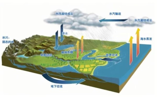 水循环是自然界的水以各种形态通过蒸发、输送、凝结降落、下渗和径流等环节