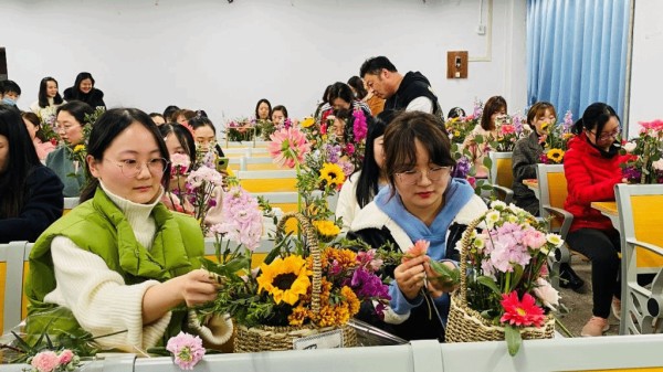 本次活动邀请了中原花木交易博览会花艺大赛金奖获得者崔春先生为大家进行培训。首先,崔先生用PPT为大家讲授《插花基础培训》知识,让大家对插花艺术的发展、花材特点、插花分类、器皿选择、色彩搭配等有了初步的了解;接着,进入实战插花环节,女教工们情绪高涨,在花艺老师的悉心指导下,拿起事先准备好的当季鲜花、剪刀、器皿等插花工具,发挥各自想象力,按照插花艺术基本技巧,将多姿多彩的鲜花按层次搭配在一起,创作出自己心仪的花艺作品;最后,大家纷纷手捧精美花篮展示自己的作品,分享喜悦的心情。