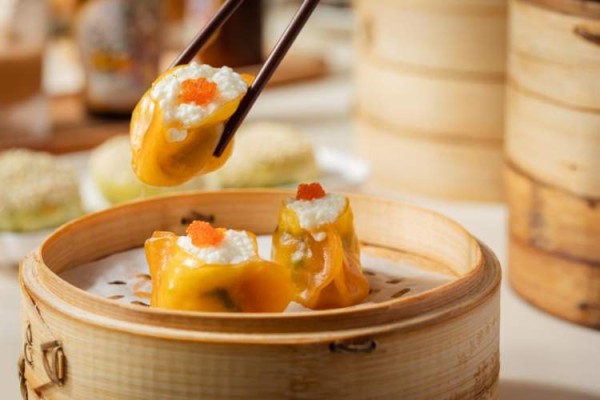 饺皮薄韧、虾仁大颗、形似凤眼的赛螃蟹凤眼饺,融合了传统名菜“赛螃蟹”的制作工艺,外皮融入了胡萝卜汁染成漂亮的橙色,顶着嫩滑的蛋白,展示了将平常的食物变成佳肴的艺术。