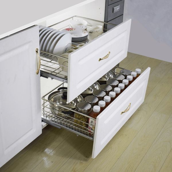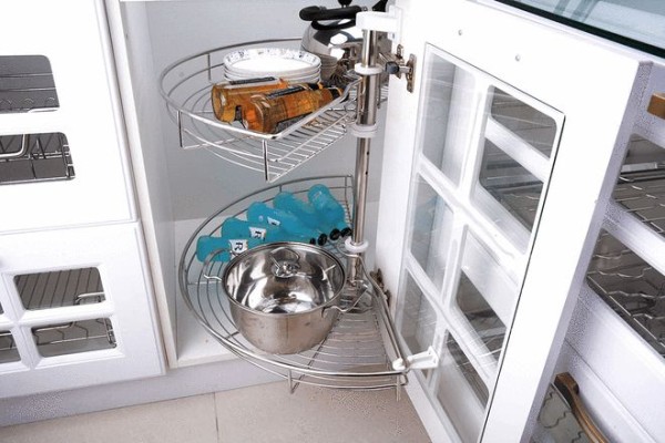 橱柜的选择多考虑抽屉、拉篮式即开即关,除非是大电器需要摆放在橱柜内,否者在使用过程中真的会比平开式方便许多,抽拉式利用恰当可以节省台面放置调料的空间,在L型橱柜中可以选择转角拉篮,尽量选择结构简单的方式,转角拉篮结构越复杂,后期维护几率越高。