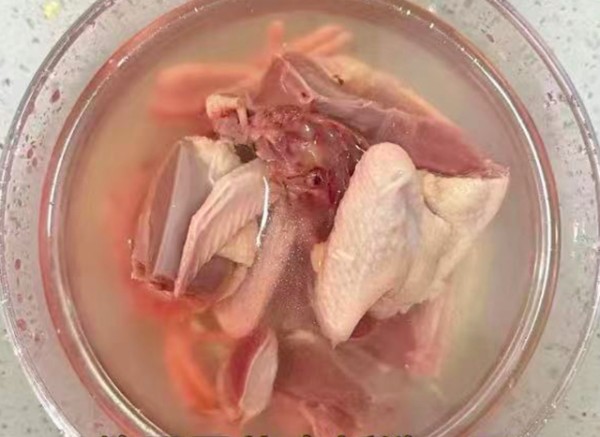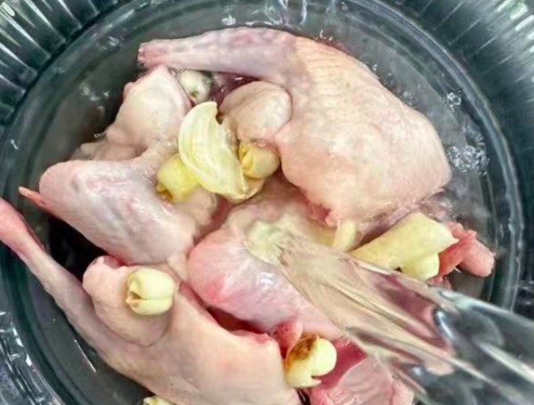 2、鸽子处理好,冷水浸泡冲洗去血水。也可以焯水一下。