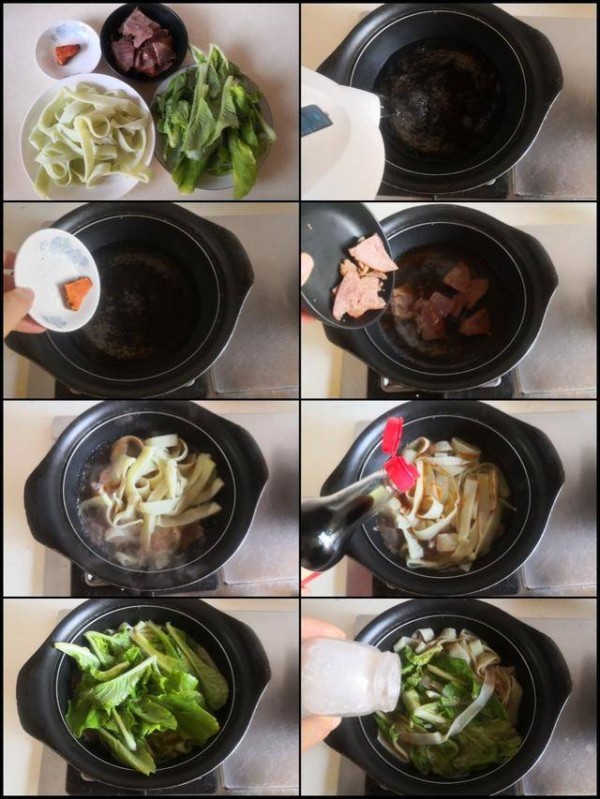 制作:1. 准备好原材料; 2. 将适量的水倒入锅中烧开; 3. 加入小块火锅底料放进锅中去煮; 4. 大火煮开后加入熟牛肉片放进锅中去煮; 5. 大火煮上两、三分钟后加入豆丝进锅去煮; 6. 加入1勺生抽上色; 7. 加入洗净的小白菜放进锅中煮至变色; 8. 加入少许胡椒粉和盐调味即可;