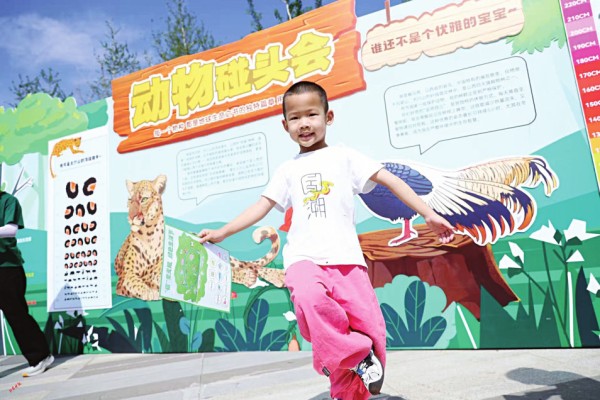 生物多样打卡区则变身“动物碰头会”。与跳高“健将”原麝比跳高,与视力极佳的华北豹比试动物识别,与褐马鸡一样金鸡独立,与黑鹳比大长腿(踩高跷)……山西的珍稀动物,根据其自身特点,全部转化为可亲身参与的游戏。“别看褐马鸡体型不大,但性情暴躁,勇猛善斗……”志愿者生动的描述让游客们瞪大了眼睛,有的孩子还模仿起动物的姿态,在互动中加深了对保护生物多样性的理解。