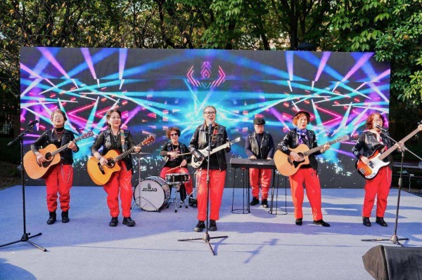 大关风荷吉他摇滚乐队,是大关街道近年来挖掘培育的本土文化社团之一。她们以音乐为载体,经常性投身于街道的各项公益活动。比如“摇滚奶奶”们就加入了“蓝马甲”公益团队,以音乐为媒介,创作《蓝马甲之歌》,为老年人提供数字助老及老年反诈公益服务。
