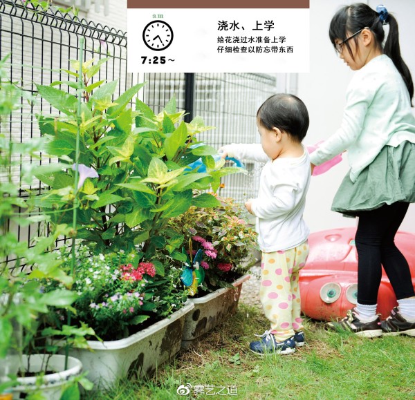 刷完牙,给院子里的花浇水。想要在院子里放上鲜花,这也是女儿提出的,她还规定自己要每天给花浇水。这之后就到了该上学的时间,确认书包里的东西,查看有没有忘带的。