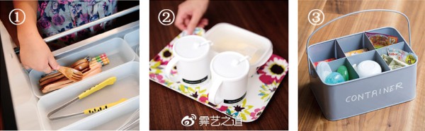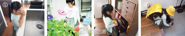 ① 儿童餐具。放在孩子们可以自己拿到的抽屉外侧。除了危险物品,都放在孩子能够自由取用的地方。