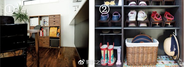 ① 孩子视线的收纳场所。书包按女儿的希望放在餐厅柜子的右列第二段上,她的理由是这里有过道方便取放。幼儿园时代的准备。当时包和帽子都收纳在玄关。这之前是放在女儿房间的,但经常会忘记,所以移到了穿鞋时能够看到的玄关。