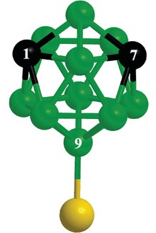 笼状碳硼烷硫醇分子,黑色、绿色和黄色球分别表示C、B和S原子。图片来源:ACS Nano [4]