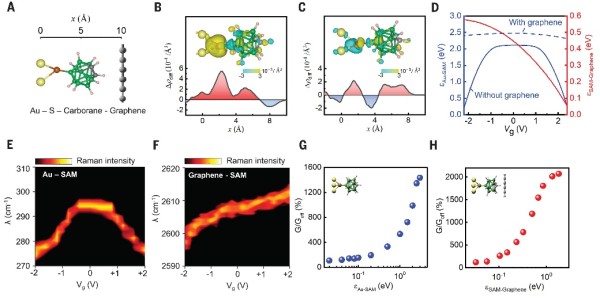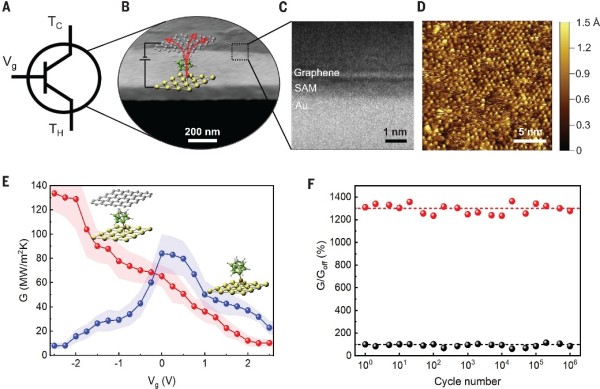 UCLA的研究者借用电子晶体管的符号来表示热晶体管开关的概念,器件采用笼状碳硼烷硫醇单分子层(SAM)作为沟道材料,底层蒸镀金(Au),顶部则转移上单层石墨烯。沟道两端分别与冷热源(TC和TH)相连。通过第三端可作为栅极,使用电场控制沟道的热导率。