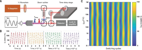 热晶体管开关除了具备高开关比之外,还具有超快的开关频率。利用泵浦激光束加热,飞秒激光脉冲检测温度响应,从而确定热导率。热晶体管的热导率可以在0.1 Hz到1 MHz频率下实现开关状态的可逆切换。通过对热传导进行电场控制,高开关频率更容易与现代电子工业兼容,使声子与电子和光子相结合,用于未来的信息处理。