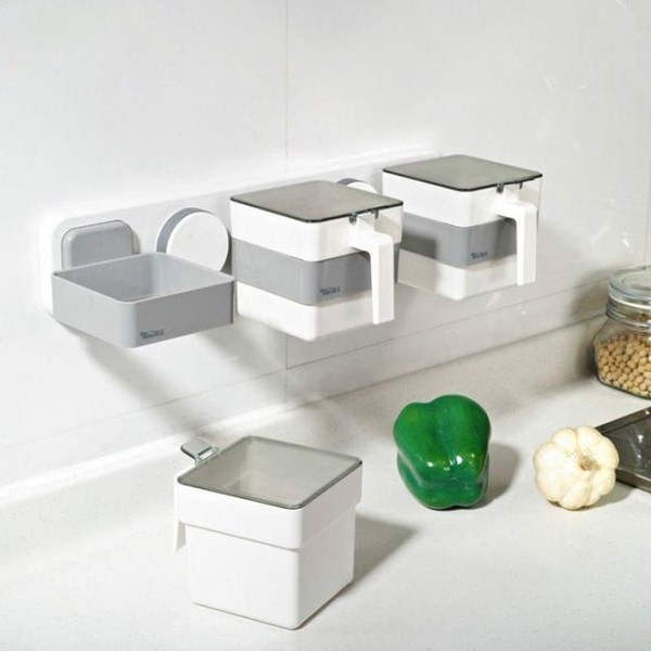 传统的调味盒放在台面上十分的占空间。而且因为离烧菜锅很近,很容易受油烟的污染,盒子的表面会变得异常油腻,容易粘附更多的细菌。放在抽屉里拿取又十分的不便,这个时候可以考虑将它放在墙面上。