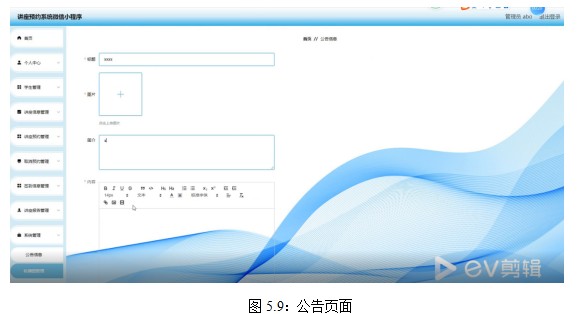 管理员通过后台的登录页面,选择管理员权限后进行登录,管理员的权限包括学生信息管理和文章公告管理。讲座公告管理,添加讲座公告信息,给学生发布一些学校的公告内容,为学习提前做准备,管理员管理后点击退出,注销登录信息。