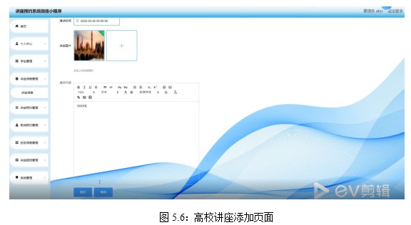 在系统主界面中的导航菜单中,有高校讲座管理按钮,点击按钮,就可以在高校讲座管理界面进行高校讲座信息添加和管理。其中高校讲座添加的界面如下: