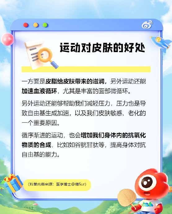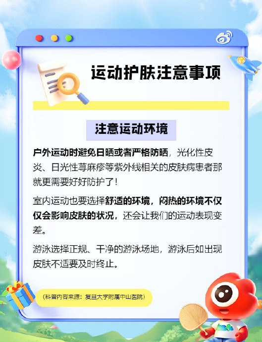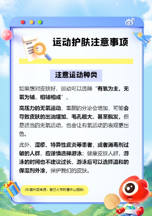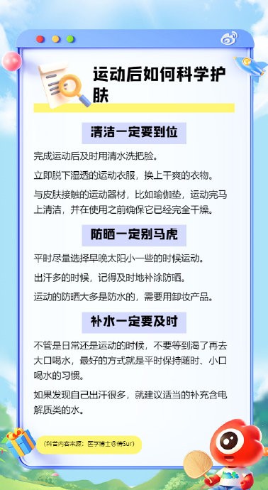 【#运动后如何科学护肤#】#健康生活方程式#巴黎奥运会正在火热进行中,奥运选手带妆参赛也引起了大家对带妆运动、运动后如何护肤的讨论。众所皆知,运动可以帮助改善皮肤状态。若是想通过运动让皮肤变得更健康有哪些需要注意的呢?夏天运动后又该如何科学护肤?来看看医学博士@倩sur 和这些医院的科普吧~#健康与奥运同行#(科普来源:医学博士@倩sur、上海市皮肤病医院医学美容科、复旦大学附属中山医院)