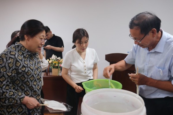 第二阶段为“非遗漆扇”,漆扇是以扇子为载体,运用国家级非遗漆染工艺手工染制而成的艺术品。大家将自己喜欢的颜色滴进水中,用木棍搅散出花纹,将白色的扇子浸入水中,轻轻旋转后拿出,制作出“荷塘月色”、“风吹麦浪”等一把把独具特色的扇子。