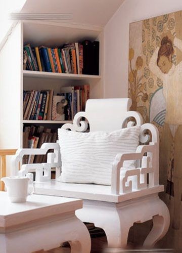 两张破旧的中式榻,去掉下面的沉重底盘,其中一张榻直接去掉扶手,成为一个敦实的几,拼齐另外一张榻,刷上白色,再配以纯白色的靠包,在阳光下显得如此动人。