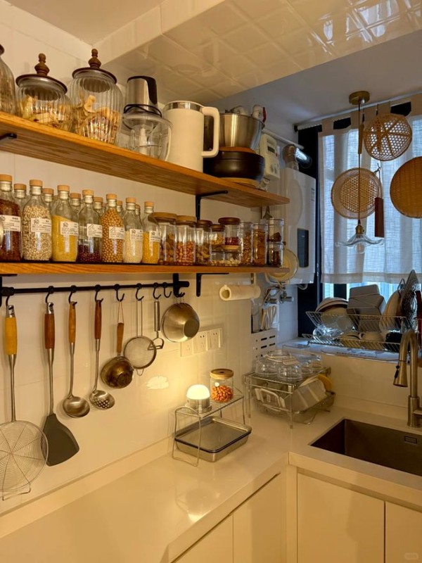 厨房不装吊柜而选择安装墙面置物架,也是很多网红设计中经常出现的厨房装修设计点,如果你也打算原样照搬的话,我劝你趁早打消这个念头。