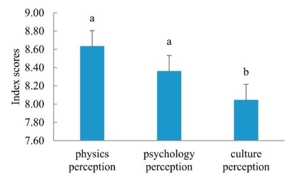 研究表明:居民感知水平的综合指数得分越高,实现居民需求的难度越大;物理感知需求是人类的基本需求。研究发现,若居民的物理感知综合指数得分较低,他们的心理和文化感知的综合指数得分通常也会较低;具有高指数得分的物理感知并不一定对应于心理和文化感知的高指数得分,上述研究结果与马斯洛需求层次及该研究提出的基于景观生态的感知水平一致;居民的物理感知通常比其心理和文化感知具有更高的综合指数得分(图4),原因在于与心理和文化环境相比,物理感知环境的构建和重建是短期过程。
