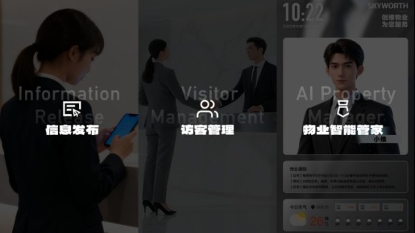 基于这一方向,酷开科技敏锐洞察到物业行业在服务智能化、管理数据化、品牌高端化的升级需求,联合旗下重点孵化的智能梯媒企业创视科技,深度整合自身AI原生技术底座与创视的垂直场景运营优势,共同推出融合 “百寸大屏 +AI管理终端” 的整体解决方案——AI物业服务平台,以 “小程序为客户端 + 大屏为展示终端” 的核心架构,涵盖掌上信息发布、访客管理、AI物业智能管家三大核心功能,助力传统楼宇在管理及服务上的智能化跃迁。