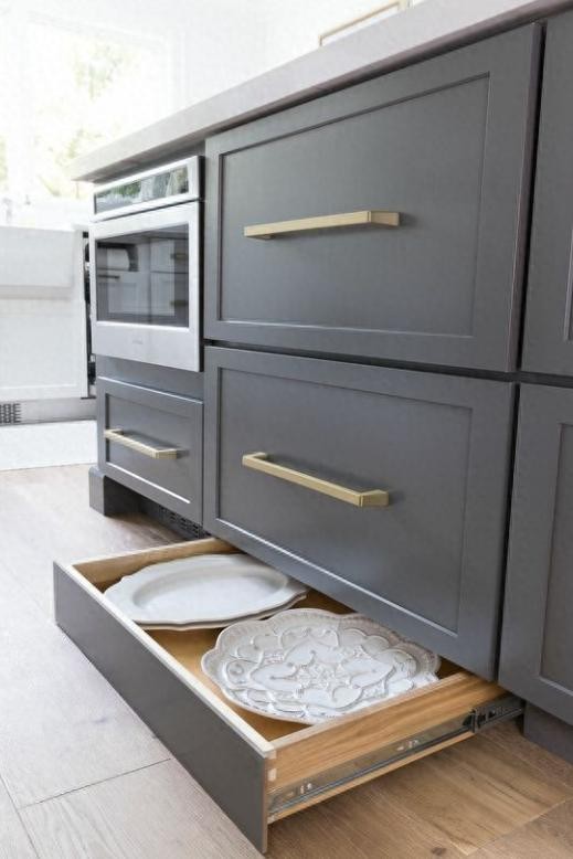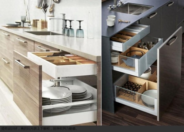 抽屉可以采用多层的设计,隐藏式的设计,不影响外观,还可以实现储物的翻番。内部可以根据自己的收纳习惯,进行多格的设计。