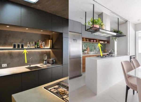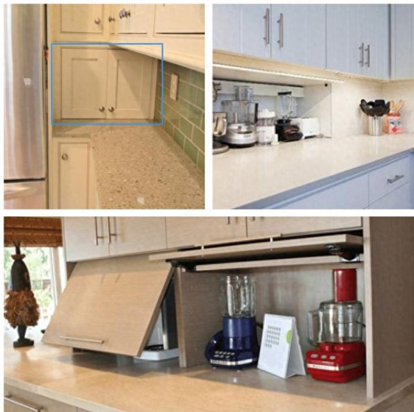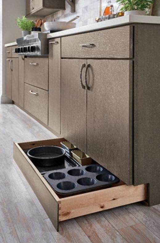 以前多半是空着,如今可增加一道隔板,就可以实现收纳的增加。特别是墙面可内嵌的,用于日常的小家电收纳,非常合适。而且这一道隔板,也不会受到油烟的影响。