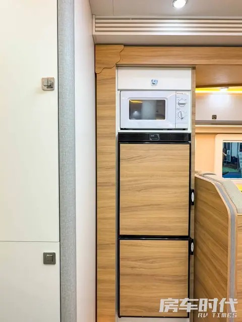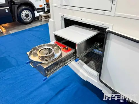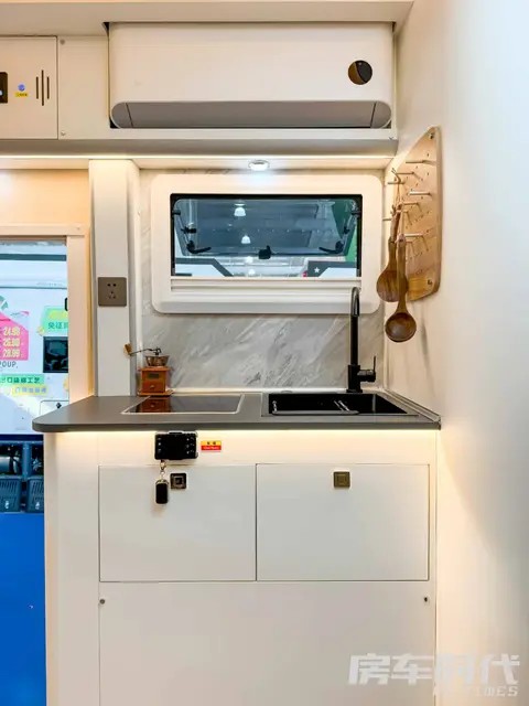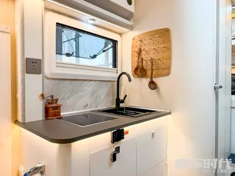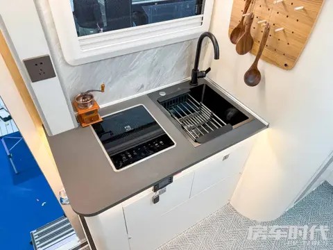 车门左侧,副驾驶后方为储物柜和3kg洗衣机;厨房区位于车门另一侧,一体式橱柜台面上配备有800W电磁炉、不锈钢水槽、独立水龙头,下方是多个储物柜;侧面墙体上有洞洞板置物架;上方则是家用空调。