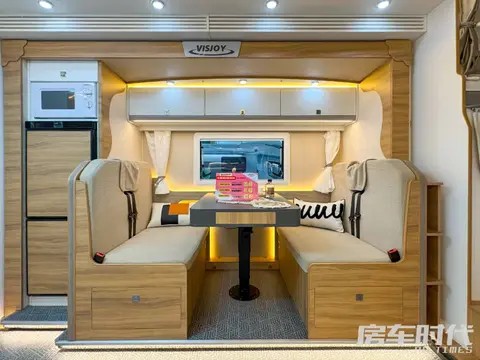 得益于轻卡房车方正的后车厢和双拓展结构,驻车状态下生活区非常宽敞。根据厂家公布的数据,左拓展机构尺寸为2800×670mm,后拓展则是2000×600mm。内饰采用大面积白色和木纹饰板搭配,看起来简洁温馨。