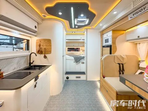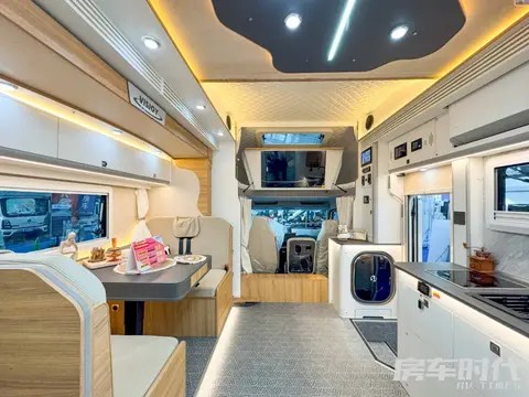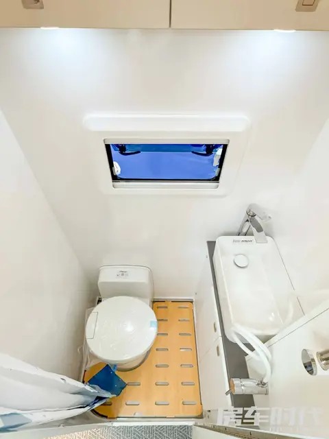 卫浴间位于厨房区和休息区之间,配备有马桶、洗手池、淋浴花洒等。水电系统方面这款房车配备有500L清水箱、100L灰水箱、17L黑水箱、40L热水器、24V 200Ah生活区锂电池、3000W逆变器等。售价方面这款房车官方售价40.98-44.98万元。