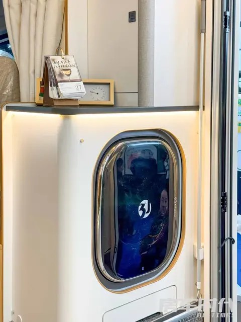 尾部休息区采用横置布局,三侧均有外推窗,还配备了多个储物吊柜,尾部甚至有两层,储物空间很多。