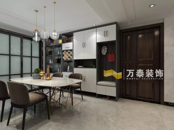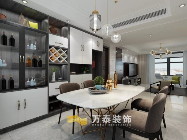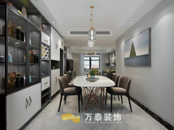 透明的收纳展示柜和酒柜,不至于让整个餐厅看起来有狭窄之感。现代气息的餐桌和灯具既精简又小资。