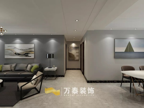走廊设计精简,线条吊顶做出客餐厅的区域分隔,挂画则又增强了整体空间的画面感。