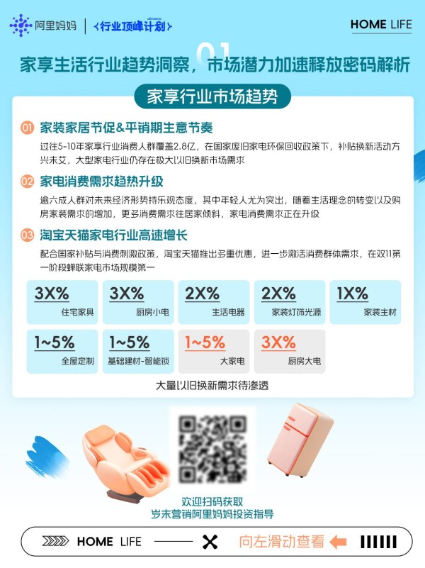 围绕「家享生活行业」市场趋势与需求升级,解码国补政策下家享行业市场机遇,引导商家在岁末前夕提前布局、尽早规划,通过重要品类交叉渗透与场景化组合,在销售窗口期迅速对接消费群体心智。