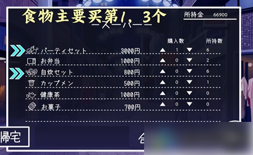吃饭的选择有5种,分别是:派对、便当、自炊、杯面以及不吃,其中前四个选项都需要消耗食品,选择推荐选择派对或者自炊
