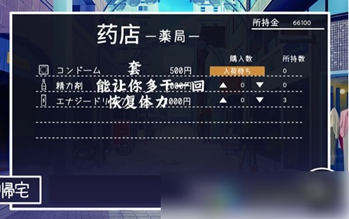 药店:药店有三种按照自己的需求买,第一个是气球,第二个是精力剂,第三个是回复体力