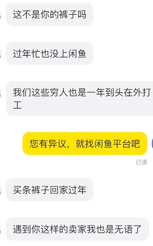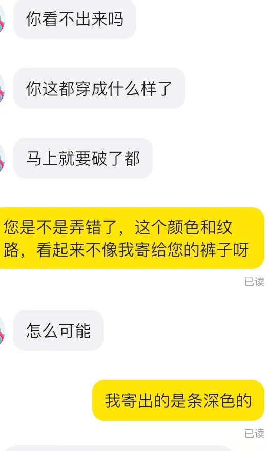 买家收到货后,就马上跟我说,我的裤子是旧的,都快要磨破了,要退货