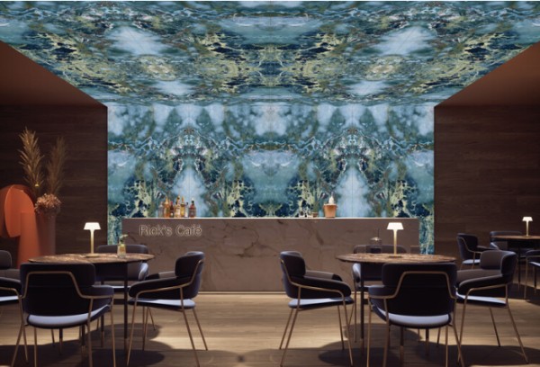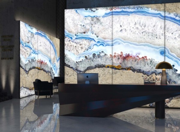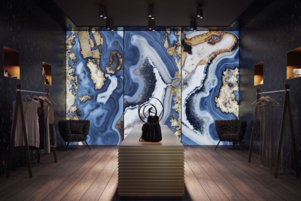 与此同时,Tecnografica 的装饰墙面板的精细细节和生动色彩也鼓励着人们的移动。例如,该厂商的 Smart Panels——比如在法国圣马洛的Le Grand Hôtel des Thermes中选择安装的装饰矿物灵感的Giant Agate和Maui Blue设计——超薄(2.5毫米)、超轻(3公斤/平方米),尺寸可达150 x 300厘米。它们的超大尺寸和轻盈结构意味着这些防水聚碳酸酯面板,无论是光泽或哑光表面,都足够大且灵活,可以包裹曲面,帮助引导消费者走向新的路径。
