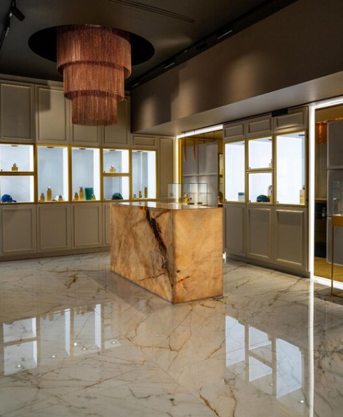 面板迷人的大理石纹理美学与商店在市场上的奢华定位相得益彰,而背光面板的半透明性使得商店的中央台能够吸引顾客进入空间中心。尽管 Dècora Glass 面板具有较小的厚度(8.7毫米),使其更轻便易于安装,但该产品也拥有高强度的结构能力和抗性,使其成为珠宝店柜台的理想选择——面板被选用于中央台的边缘和台面。