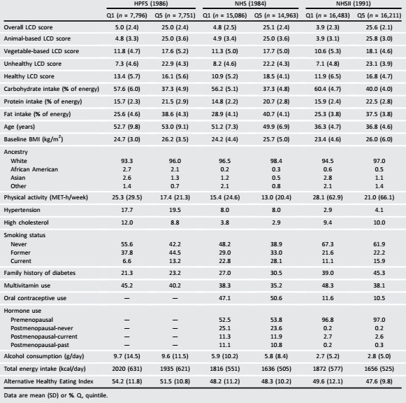 表:HPFS(1986–2018)、NHS(1984–2018)及NHSII(1991–2019)队列中,LCD评分(五分位数)与2型糖尿病风险的合并比值比(95%置信区间)