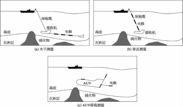 海底SP测量可作为单一调查设备独立测量,或者加挂在其他海底调查设备(如摄像拖体)上进行协同测量。海底SP测量装置通常包含电场传感器、拖曳导线和采集舱三个主要部分。其中电场传感器通常采用Ag/AgCl电极;拖曳导线实现电极至采集舱之间的信号连接;采集舱用于放大、记录、存储和传输电位信号。其常见的加挂方式有三种(图5.39):一是悬挂在光缆或同轴缆上进行垂直观测,记录自然电场的垂直分量;二是加挂在拖体后方进行水平观测,测量自然电场的水平分量,通过调节电极距的长短来改变不同的观测方式,在水平拖曳时,为保证传感器的水平,需要合理配置浮力,并在尾部加挂阻尼伞;三是借助AUV搭载观测装置进行小范围灵活自主详查。船载测量时,调查船以1~2节的速度拖曳测量仪在海底上方20~50 m高度匀速前行,记录近海底SP。AUV近海底测量时,可同时测量正交的三分量自然电位,相比船载深拖能更接近异常体,观测精度更高,更适用于小范围异常体的详查。