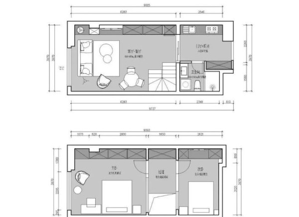 这是平面布置图,一层为起居室,二楼有两间卧室,大家可以参考一下。