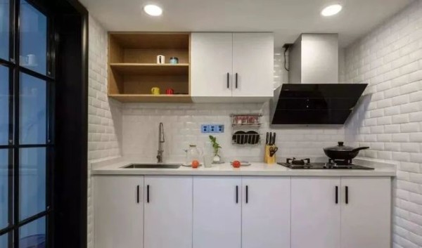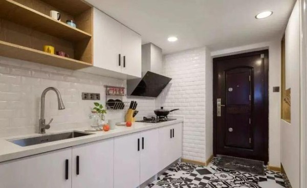 地上铺了黑白花砖,十分的大方耐脏,便于卫生清理,白色的橱柜和墙面,中间穿插黑色拉手、原木色吊柜,使整个厨房看起来干净整洁又时尚,吊柜留一个不设柜门,可以放一些油盐酱醋之类的调味料,用的时候就不用打开柜门找了,很方便。