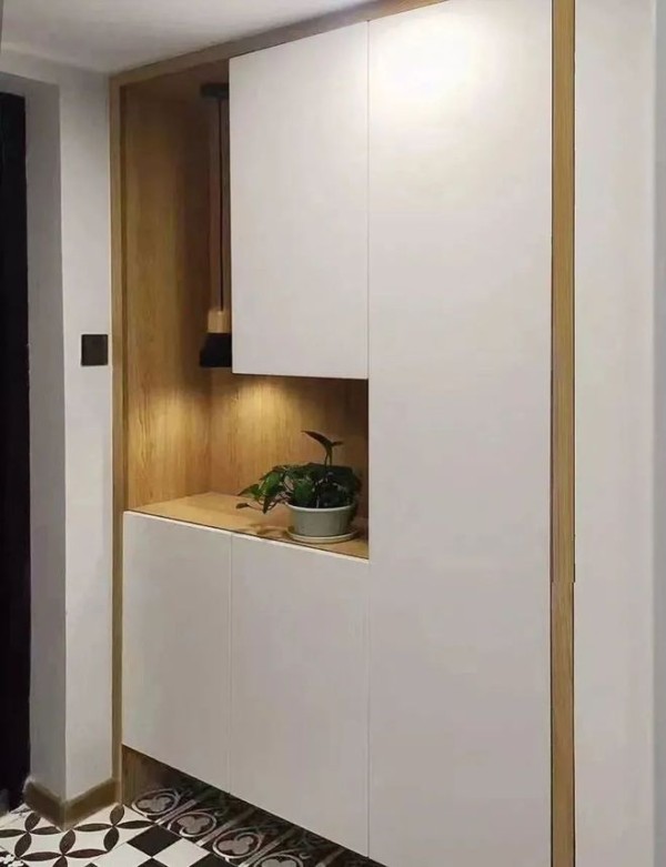 左手边是玄关柜,白色和原木色搭配的柜体,在灯光的照射下,越发的自然温馨了,还显得很有格调。柜子中间镂空设计,适合放置钥匙、包包之类的小件物品,或者放上盆摘,作为玄关处的展示也不错,底部留了常用放鞋位,方便自己的同时也方便了客人。