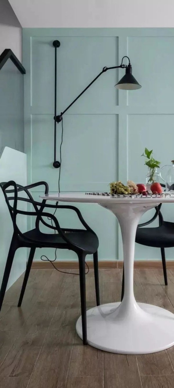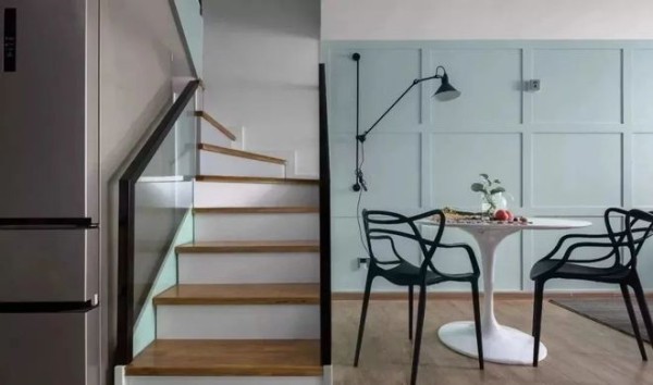 再看楼梯的两边,左边利用了楼梯角的空间放了一个冰箱,高度合适,不占位置。楼梯右边是餐厅,白色餐桌搭配黑色餐椅,充满了北欧风的特点,十分的经典时尚耐看,搭配精美的餐具和桌布,再加上一盏摇臂灯,让用餐氛围也变得很有情调,这盏灯是可以任意调节照明角度的,使用很灵活方便。