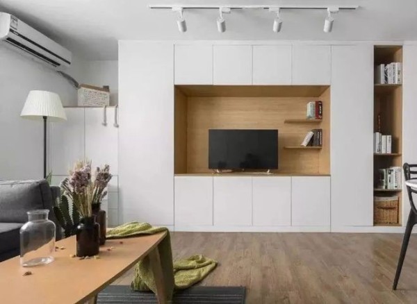 对面的电视墙也设计得很有特点,虽然没有做什么线条和造型,但是直接做成一整面的收纳柜,对于小户型来说会更加实用,把中间和侧面留空,分别放置电视和书籍,而其它的柜子则用来存放一些家居杂物,这样既增加了房间的储物功能,又起到了背景墙的装饰效果,值得参考。