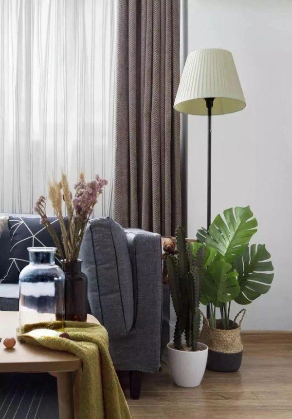 沙发靠在了窗户边,冬日的下午可以慵懒地坐在这里看看书,晒晒太阳,或者小憩一下,相当的舒适惬意,到了夏天,可以把位置变换一下,反正是双人位的矮脚沙发,轻便小巧,移动起来也方便。沙发旁边放了两盆龟背竹和仙人掌,为空间注入了一丝绿意,充满了生机和活力。