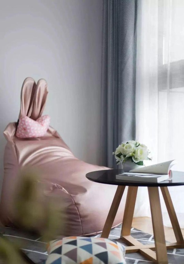 楼上的卧室的照片不全,只能看到角落的部分,这是飘窗台,上面铺了垫子,放了豆袋和小茶几,打造成了一个小小的休闲区,无聊时坐在这里看看书,欣赏欣赏窗外的风景,也是一种放松享受。