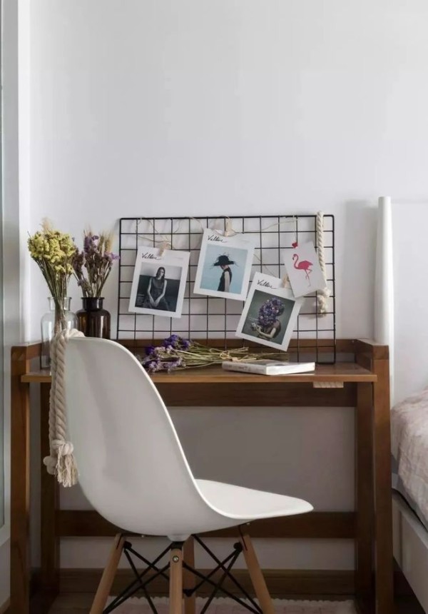 床边摆了一张小书桌,既是工作台,也能作为床头柜和梳妆台使用,桌上放了一张铁艺网格架,上面挂着各种照片,显得很温馨,同时起到很好的装饰效果,桌上的插花为房间增加了许多生气,看出主人是一个非常热爱生活的人。