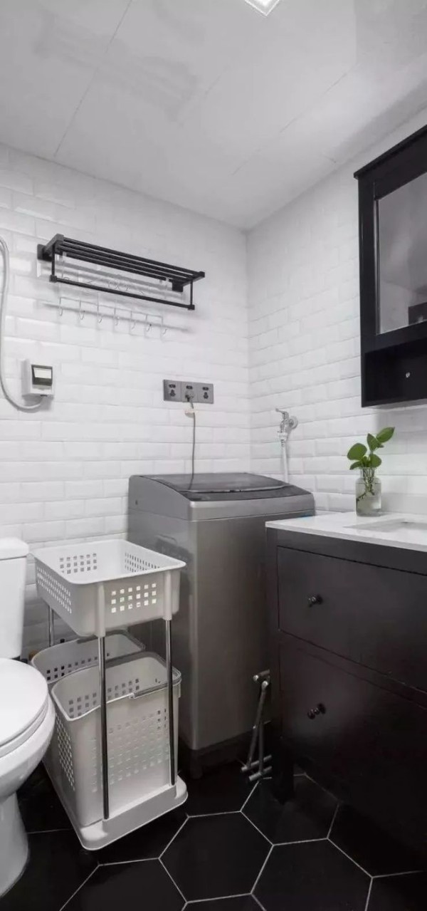 卫生间墙面贴了白色墙砖,干净明亮,地上是黑色六角砖,很时尚,这里个人感觉地面要是换亮一点的颜色应该效果会更好吧,毕竟卫生间不大,黑色显得有点压抑了,但是有个好处都是地面脏了不容易看出来。洗衣机放在墙角的,旁边有一个脏衣篮,把要洗的衣服全部放进去,集中清洗的时候会更方便。