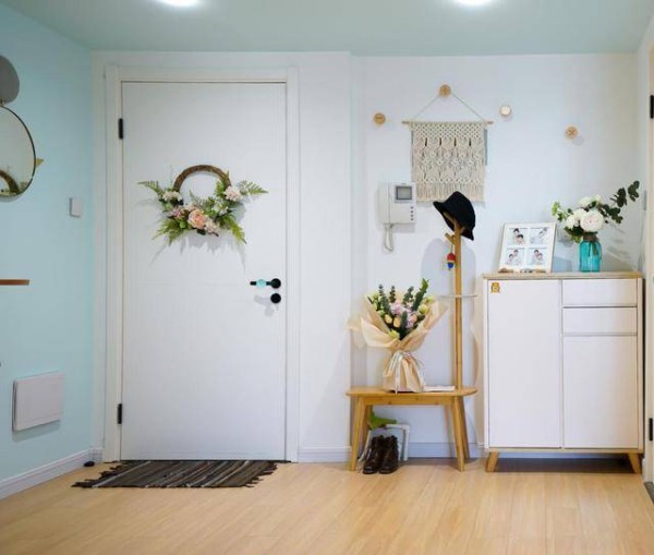 玄关设计得非常简单,一个成品鞋柜+挂帽的换鞋凳。门口的电表箱用装饰品遮盖起来,再搭配些小物件的点缀,形成一体。